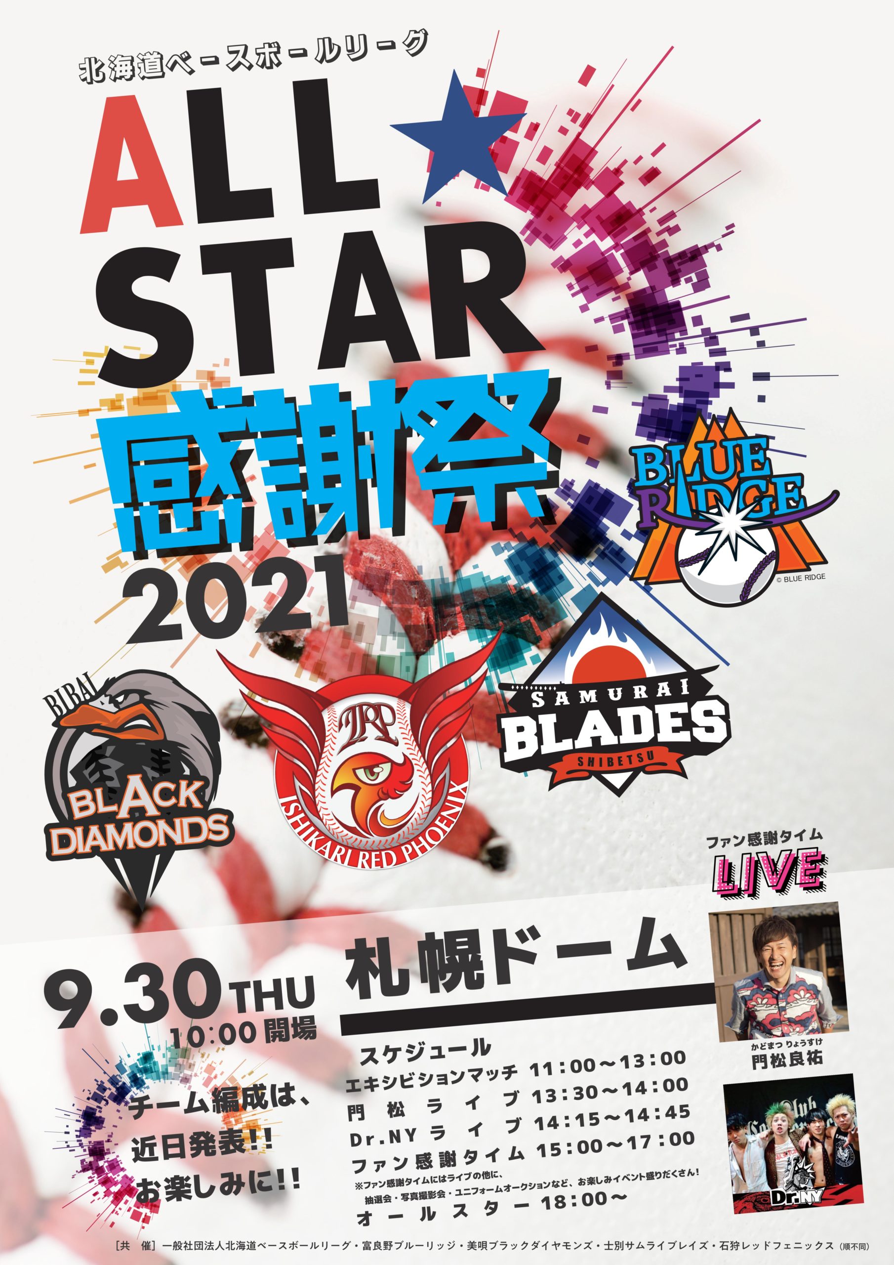 このイベントでは、皆さまからの投票で出場選手が決まるオールスターゲームや、ユニフォームオークションなどのファン感謝イベント、さらに、球団のスタジアムDJを務めるDr.NYと、美唄ブラックダイヤモンズの応援歌を歌う門松 良祐さんのスペシャルライブもあります!