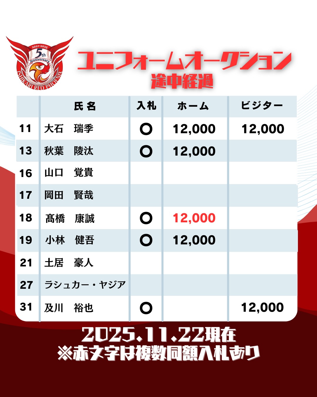 Tweet Share Hatena Pocket RSS feedly Pin it 記事のタイトルとURLをコピーする 22日(土)15時時点でのオークション経過速報‼️ 枠も埋まり始め、いよいよ後半へ差し掛かってまいりました‼️ 締切まで何度でも入札可能‼️ ⚠️入札期限は12月14日(日)⚠️ オークション会場はこちら オークション会場はこちら 【2025.12.6】球団トライアウトのお知らせ 前の記事 北海道フロンティアリーグ 埼玉トライアウト ドラフト指名結果発表 次の記事