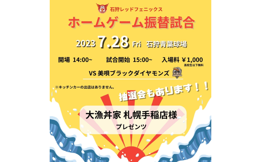 雨天中止となった試合の振替試合となる7月28日(金)のホームゲームは大漁丼家 札幌手稲店プレゼンツの冠試合となります!