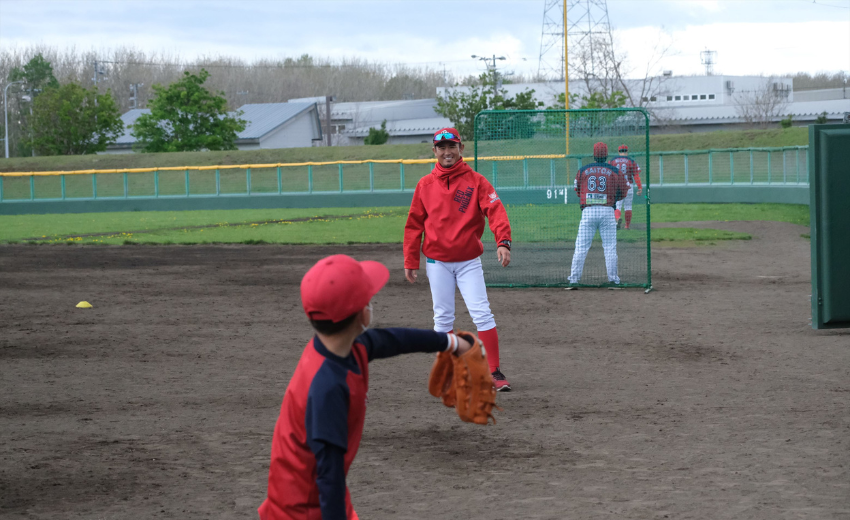 子どもたちに対してTSUBOSSこと坪井監督が自らノックをしてくれる、滅多にないチャンス!